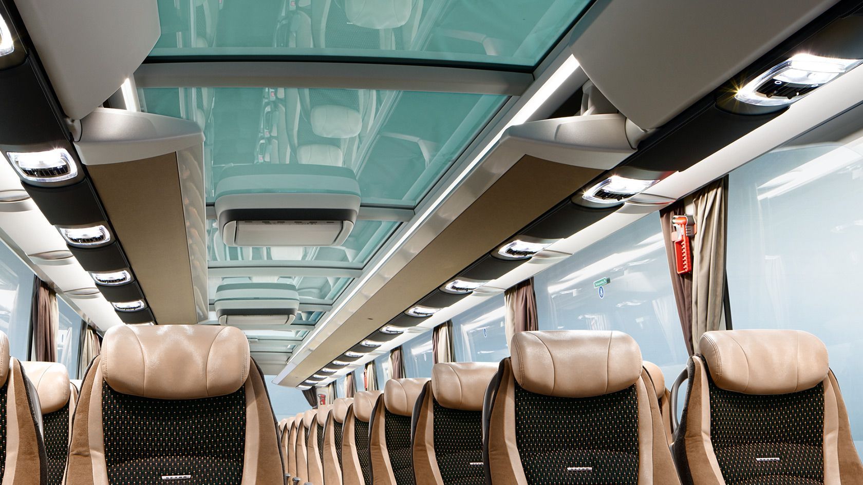 Assentos de couro ou tecido ajustáveis com almofada, descanso de pés, descanso de braços entre assentos, DVD + 3 monitores, ar condicionado, frigorífico, leitor de CD, casa de banho, luzes de leitura individuais, vidros duplos, microfone, aquecimento central e cintos de segurança em todos os assentos. Autocarro 2 pisos